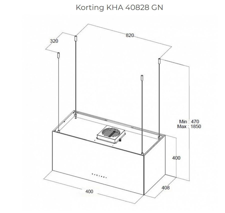 Дополнительные особенности:Крепление к потолку подвесными тросами (макс высота с учетом тела вытяжки– 1850 мм)