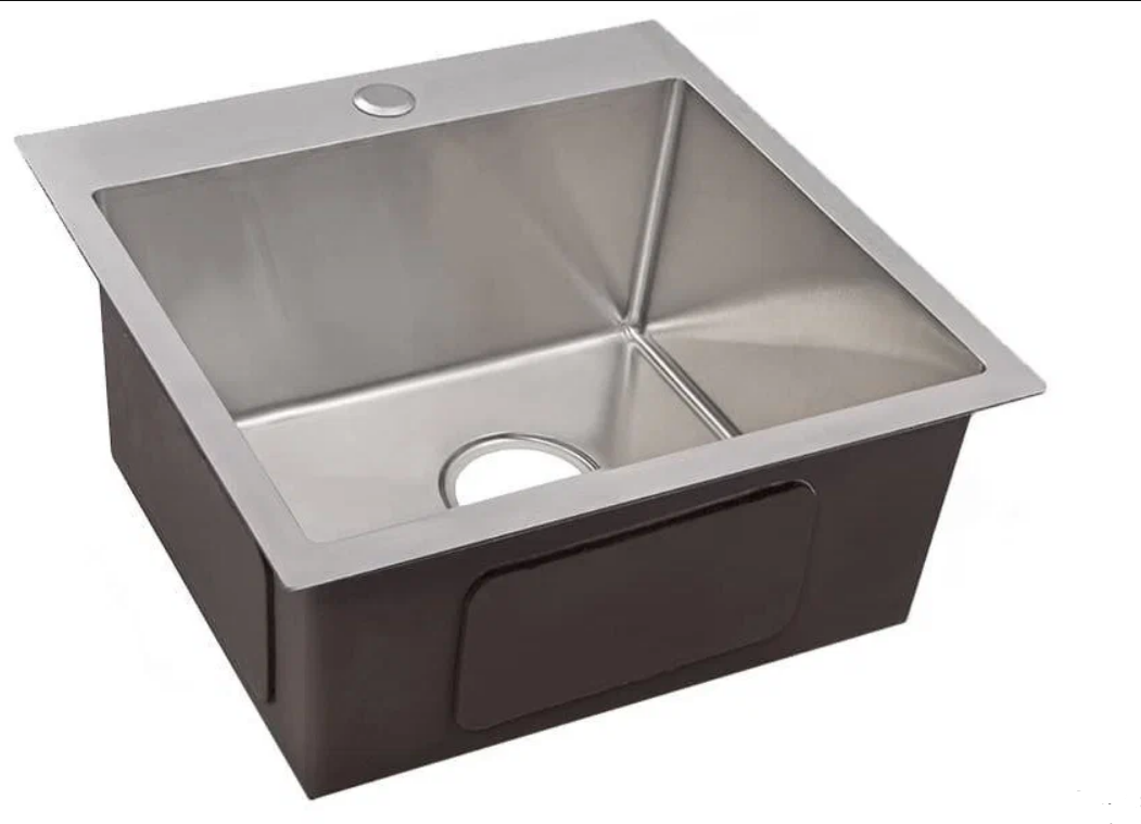 Мойка полностью ручной работы, дно сварное, в форме «конверта», корпус обливают шумопоглощающим составом серого цвета. В центре надкрылка одно отверстие под смеситель.